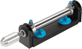 Die Kolbenstange des doppeltwirkenden Zylinders wird durch wechselseitiges Zuschalten der Druckluft umgesteuert. Eine Endlagendämpfung ist mit zwei Regulierschrauben einstellbar. Auf dem Zylinderkolben befindet sich ein Permanentmagnet, über dessen Magnetfeld Näherungsschalter betätigt werden können.