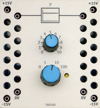 Das P-Glied ist ein Übertragungsglied aus der Regelungstechnik mit proportionalem Übertragungsverhalten. Das Eingangssignal/-potential an Eingang 1 wird um den einstellbaren Proportionalbeiwert Kp verstärkt und als Ausgangssignal/-potential an Ausgang 2 ausgegeben. Bei einem Proportionalbeiwert kleiner als 1 spricht man nicht von einer Verstärkung, sondern von einer Dämpfung. Um die Schaltkreiserstellung übersichtlich zu halten, ist die notwendige Masse (0 V) nicht als Anschluss herausgeführt, sondern intern verdrahtet.