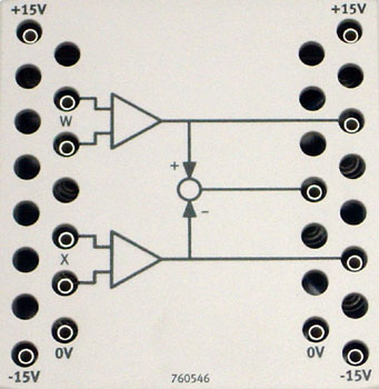 Der Differenzverstärker ist ein Element der Regelungstechnik. Am Ausgang 3 wird ein Ausgangssignal/-potential erzeugt, welches der Differenz der beiden Eingangssignale/-potentiale an den Eingängen 1 (w) und 2 (x) entspricht. In der Regelungstechnik wird der Differenzverstärker für die Ermittlung der Regelabweichung eingesetzt. Um die Schaltkreiserstellung übersichtlich zu halten, sind die notwendige Masse (0 V) und die Versorgungsspannung nicht als Anschlüsse herausgeführt, sondern intern verdrahtet.