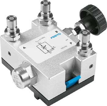 With sufficient pressure, the preset flow rate is kept constant in the direction of the arrow. The surplus hydraulic fluid is drained at connection T using a pressure compensator. The inlet pressure pA is load dependent, i.e. it changes with the outlet pressure pB. Therefore a parallel circuit of several 3-way flow control valves is not possible. In this case, the inlet pressures would be defined by the valve with the lowest inlet pressure. Compared to the 2-way flow control valve, the 3-way flow control valve is admittedly more efficient in its energy consumption.